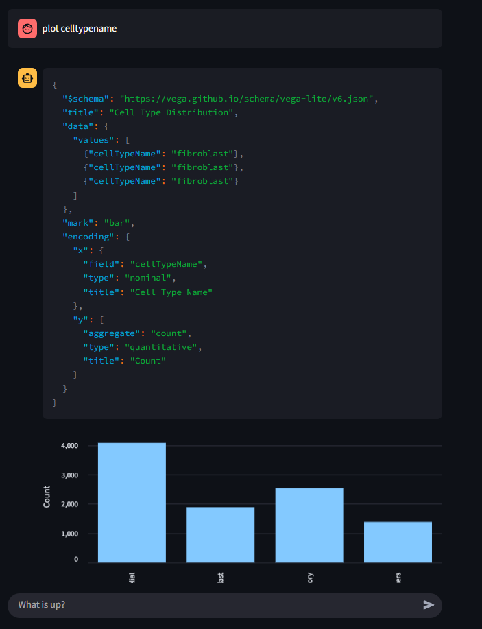 - Chart Generation: The system generates Vega-Lite JSON specifications based on the data and renders interactive charts.